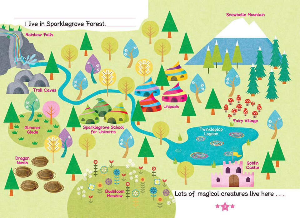 If you want to know what is in Sparklegrove Forest, here is a list of places: Rainbow Falls, Troll Caves, Glimmer Glade, Sparklingrove School for Unicorns, Dragon Nests, Budbloom Meadow, Unipods, Fairy Village, Twinkleplop Lagoon, Goblin Castle and Snowbelle Mountain. The names of all the other unicorns are equally fantastic and funny: Nutmeg Silverstrips, Scarlet Sugarlumps, Jed Glitterock, Monty Dumpling, Piper Forestine, and Sunny Huckleberry.