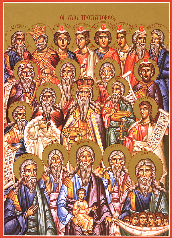 So who then are God’s ancestors? What qualifies them to be invited to this August company guests at this divine feast? As we look at the icon what do we see besides mostly Gray-haired, older men? Listen carefully to the genealogy read next Sunday from Saint Matthew and you will hear some women too. And what kind of men and women are these who are listed in the company of the Lord’s ancestors? Yes, they were all given great offices to hold like prophet and high priest, king and patriarch, but the beginning of their lives was hardly exceptional. They were idolators, murderers, adulterers, con-artists, fornicators, blasphemers, and experts in all kinds of worldly uncleanness. Yet they did not stay that way. But they obeyed the rule of today’s epistle of Saint Paul to the Colossians “…to put to death your members which are of the earth [including all those named sins] …. and put on the new men who is renewed in knowledge, according to the image of him who created him, where there is neither Jew nor Greek, circumcised or uncircumcised, barbarian, Scythian, slave nor free, but Christ is all and in all.” (Colossians 3:5, 10-11)