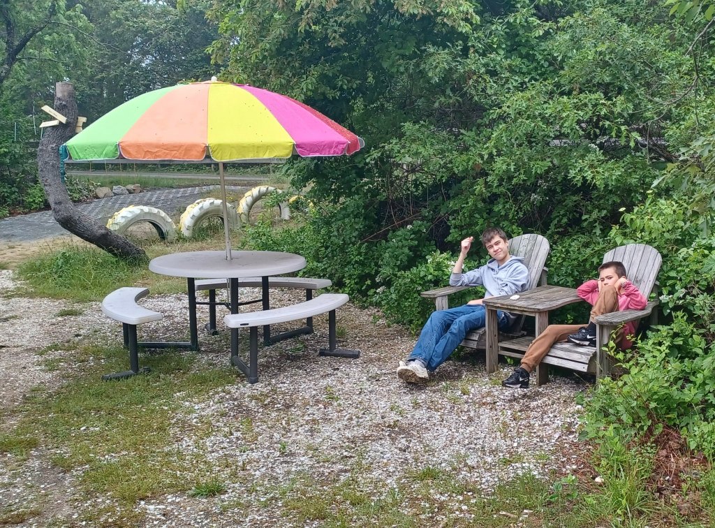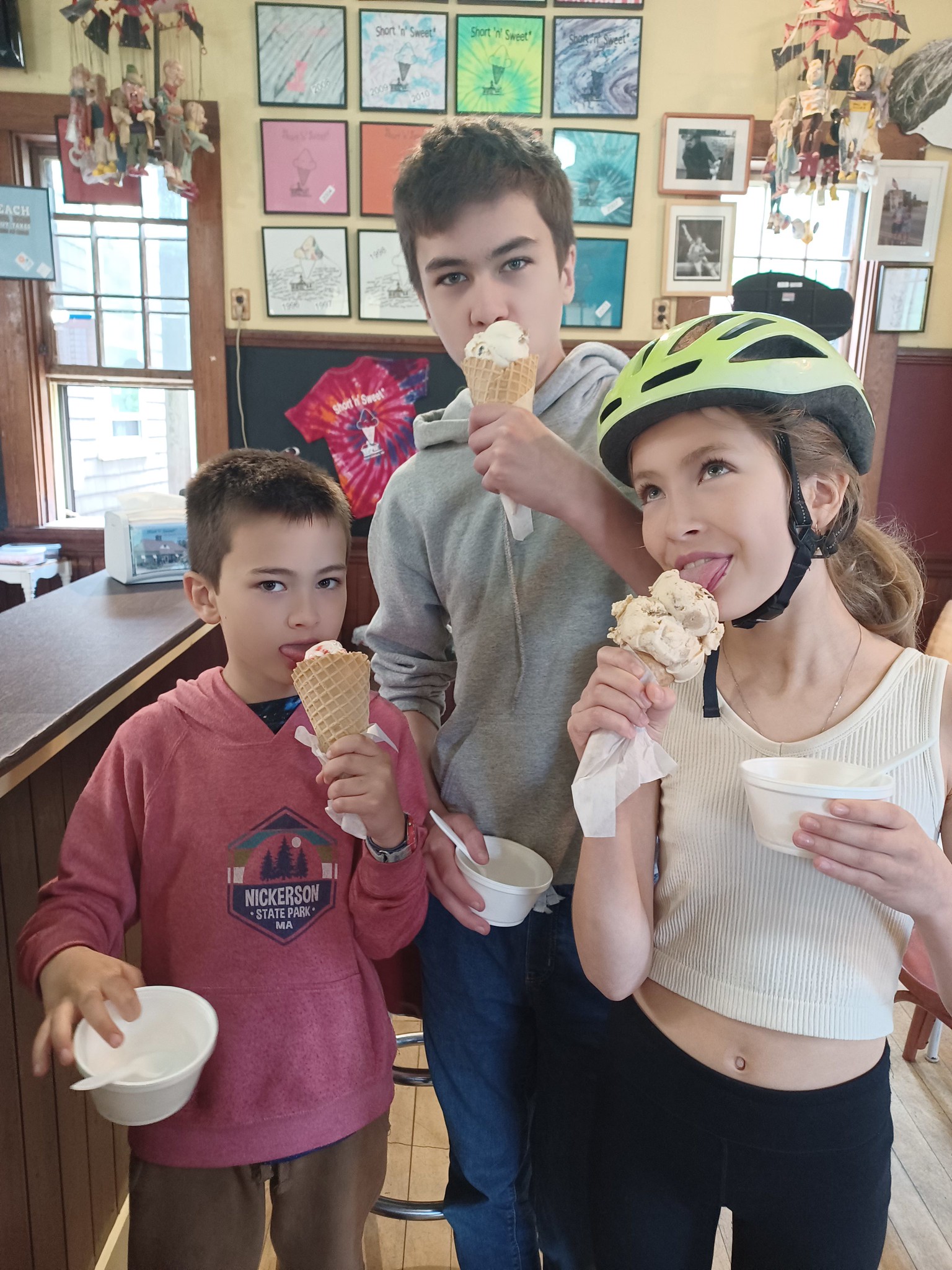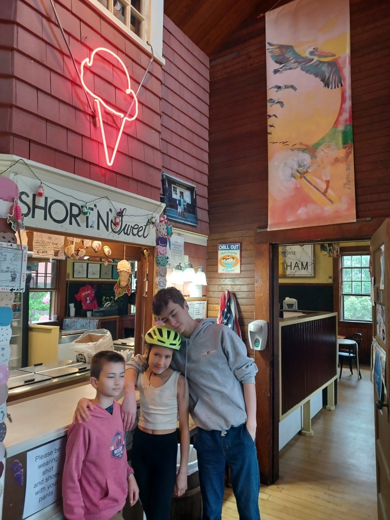 Even on a rainy day like our first day here, we are able to revive a great tradition. Bringing all four bikes from home, papa and the three youngest take a well known rail trail to a mom and pop ice cream shop called Short n’ Sweet. Biking on the Cape can get a little sketchy on some of the busier roads, but once you arrive on one of these old converted railroad lines, it is smooth going since the land is mostly flat. We arrive 20 minutes before it opens at noon, but my teens are content to luxuriate in the ample back yard that directly abuts the trail. The owner opens promptly and we choose from close to 50 different varieties of ice cream.