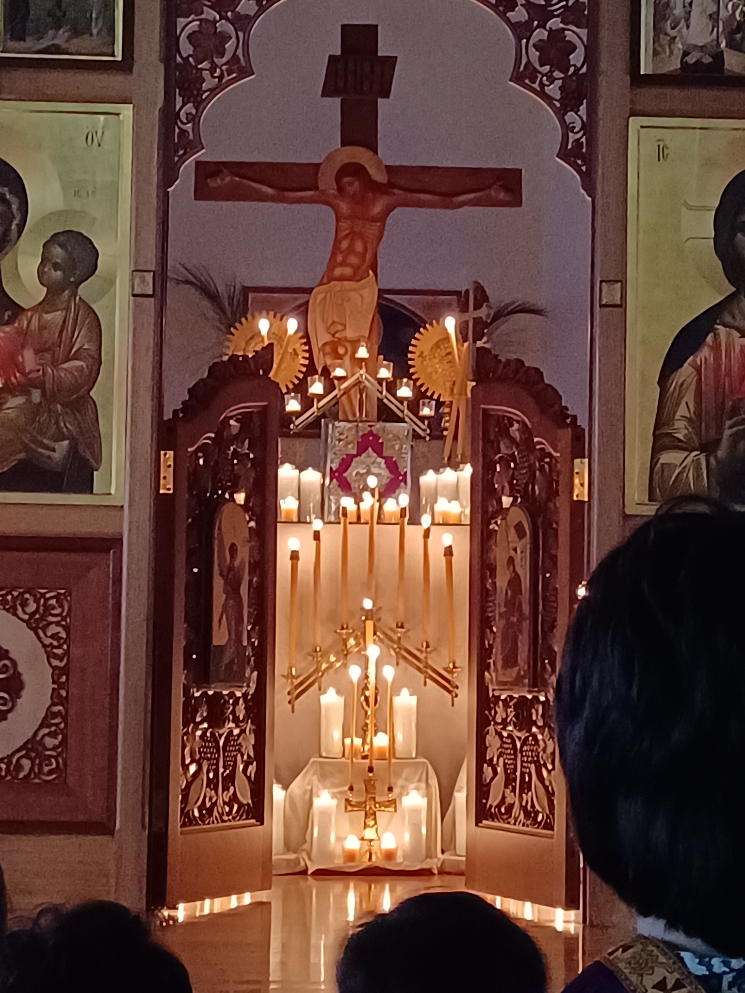 Today, we celebrated the institution of the Mystical or Lord’s Supper on Holy Thursday with a Vesperal Liturgy. Tonight in anticipation of Holy Friday will be the Twelve Passion Gospel passages outlining Our Lord’s path to suffering and dying on the cross; this service climaxes in the moment when one of the priests takes up the cross in procession around the church while the choir sings the very moving hymn, the 15th antiphon:
